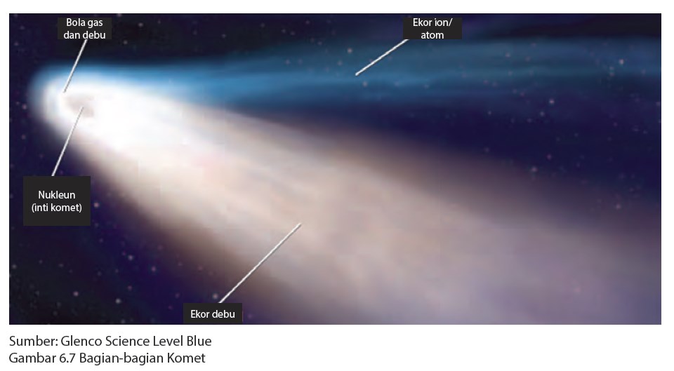 a. Inti komet, yaitu bagian komet yang berukuran lebih kecil, padat, tersusun dari debu dan gas.