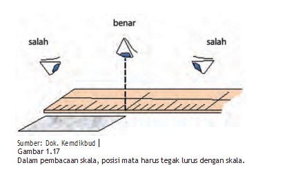 Dalam melakukan pengukuran, perhatikan posisi nol alat ukur. Untuk pengukuran panjang, ujung awal benda berimpit dengan angka nol pada alat ukur. Selain itu, posisi mata harus tegak lurus dengan skala yang ditunjuk. Hal ini untuk menghindari kesalahan hasil pembacaan pengukuran. Coba lakukan dan amati kesalahannya.